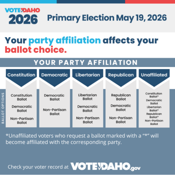 The absentee ballot request form for 2026 is available starting January 2nd. You are able to download it here and bring it in or mail it to us. Or if you’d prefer to fill it out online you can on voteidaho.gov.